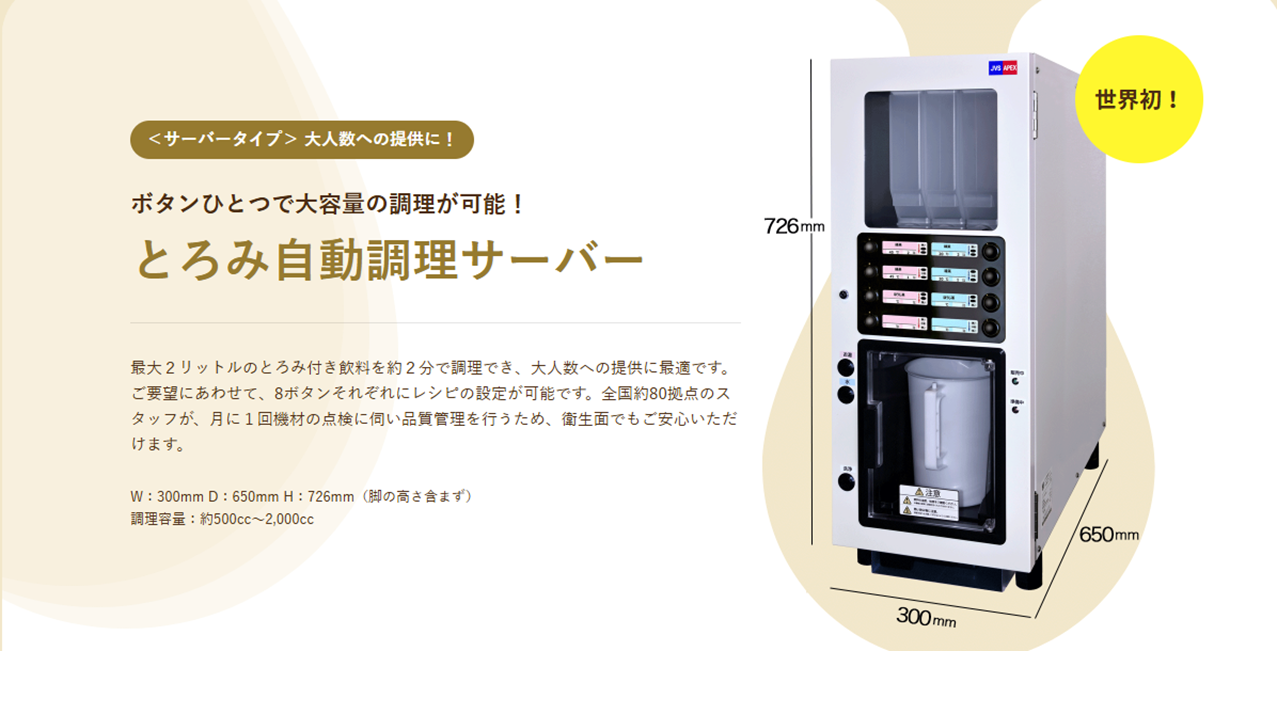 | 特徴 | 【その日から効果が分かります】医療機関や介護施設で、スタッフの手で付けられていた「とろみ」を自動調理し、誤嚥のリスク軽減をサポート。ご要望にあわせて、8ボタンそれぞれにレシピの設定が可能です。展示会で来場される皆さまから高い評価を得ている商品です。 | |